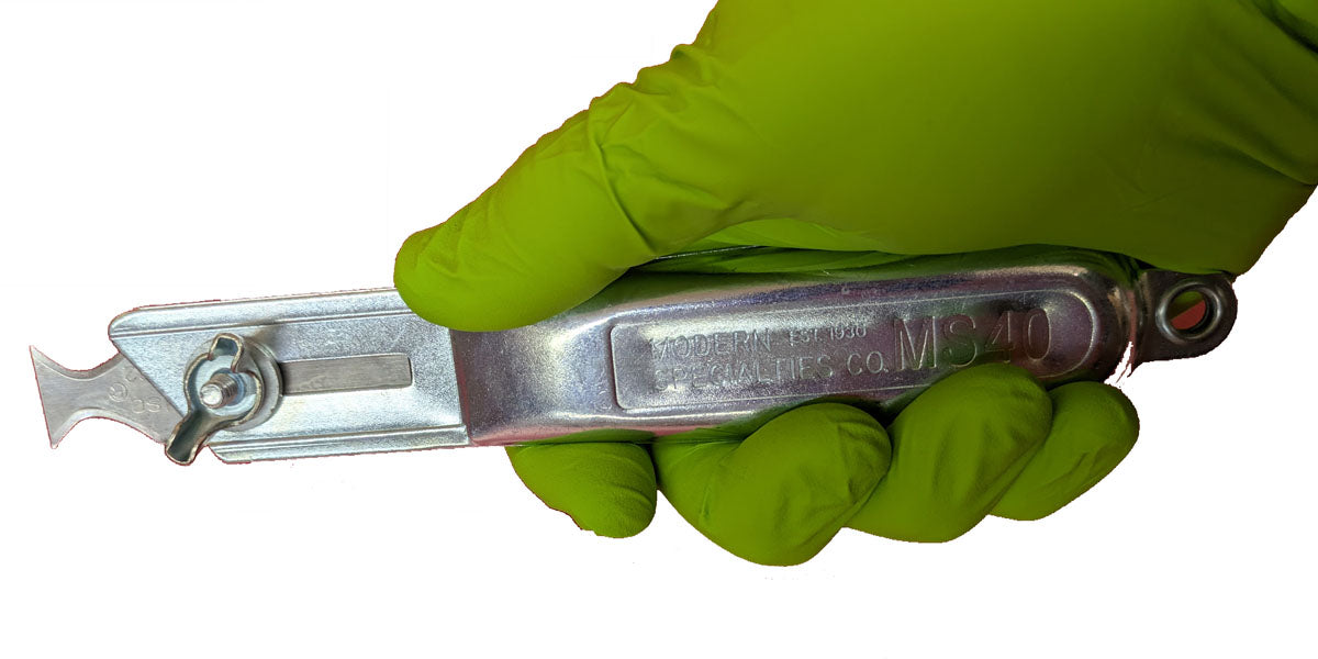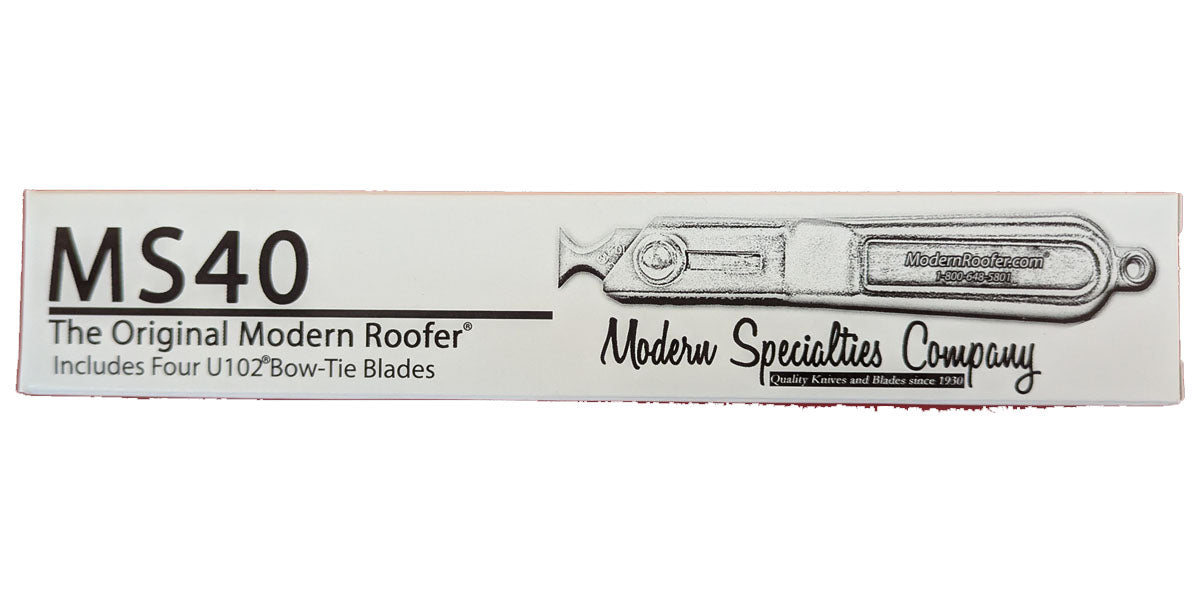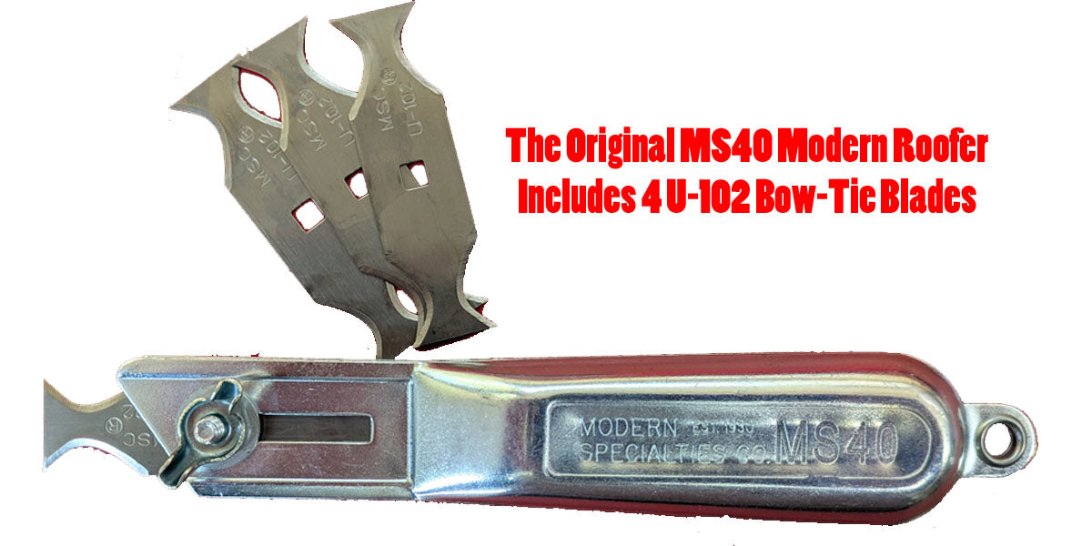 Modern Roofer™ Knife Favorite tool of professional roofers for over 75 years. Features original Bow Tie U-102 Modern Roofer blade, which easily store in handle. Very versatile, the knife will accommodate all Modern Utility center hole blades. Professional quality, constructed of heavy gauge, zinc plated steel to prevent corrosion.